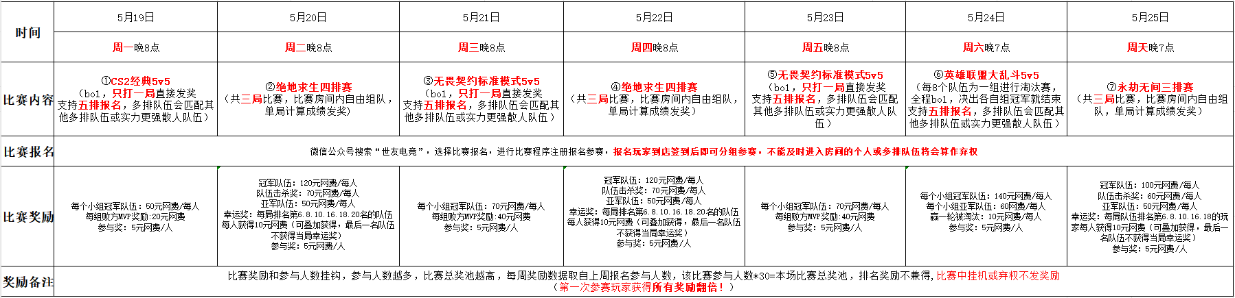 每局冠军队伍:100元网费/每人