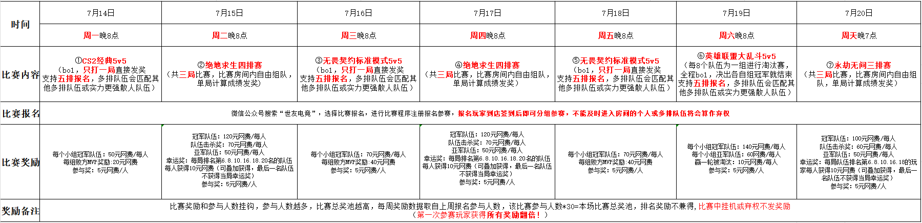 ★比赛门店:世友十九家门店均可参与,进入比赛房间自由组队。参与人数超70将开启第二个比赛房间,参赛玩家将均分到两个房间进行对决。