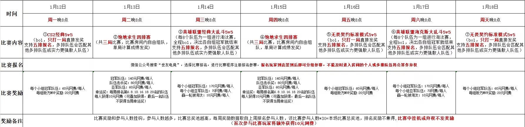 世友电竞娱乐赛赛程安排(1月12日-1月18日)